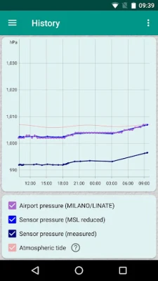 It shows: - Your local pressure - The pressure reduced to the mean sea level (the value that every weather forecast service use) - The pressure got from the nearest airport - Latest 24 hours pressure chart