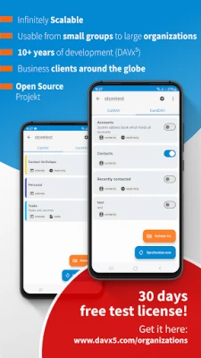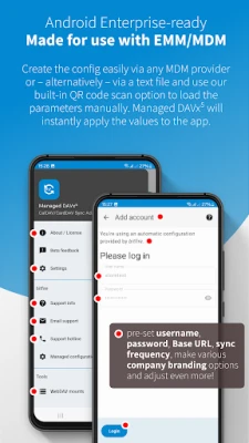 Managed DAVx⁵ has the same awesome sychronization capabilities as the original DAVx⁵ but comes with great additional features for businesses and organizations. Primarily this version is aimed to be rolled out for employees of an organization that wants to have CalDAV & CardDAV available on Android devices. Managed DAVx⁵ must be pre-configured by an admin. It can be done within minutes - and no programming is required!