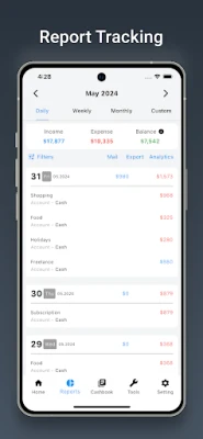 • Reports: View weekly, monthly, and annual spending trends, and export reports in PDF or Excel format for easy sharing.