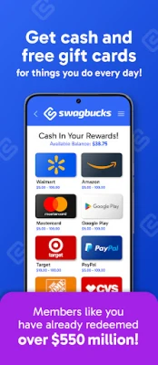 Swagbucks is the Money Making App for you with over 10,000 Free Gift Cards redeemed by our members every day! Redeem your Swagbucks rewards for PayPal cash or free gift cards at Amazon, Apple, Target, Mastercard, AmEx, Walmart, Starbucks, Uber, and more. Cash out your rewards for free gift card values starting at just $1 or save up and make money with $250 PayPal deposits. Use money towards groceries and everyday essentials or gifts for your favorite people. Shop online with your gift cards to earn even more cash back